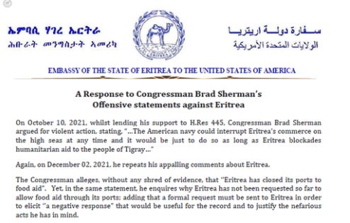 እቲ ኤምባሲ ብኣባል ኮንግረስ ኣመሪካ ብራድ ሸርማን ንዝተዋህበ ርእይቶ ምላሽ ንምባሃብ ኣብ ዝዘርገሖ መግለጺ፣ ‘ኤርትራ ረዲኤት ናብ ትግራይ ንኸይሓልፍ ከልኪላ’ ዝብል ክሲ ብምንጻግ፣ ‘ኤርትራ ወደባታ ክትፈቅድ- ክትከልእ ዛጊት ወግዓዊ ሕቶ ኣይቀረበላን’ ኢሉ።