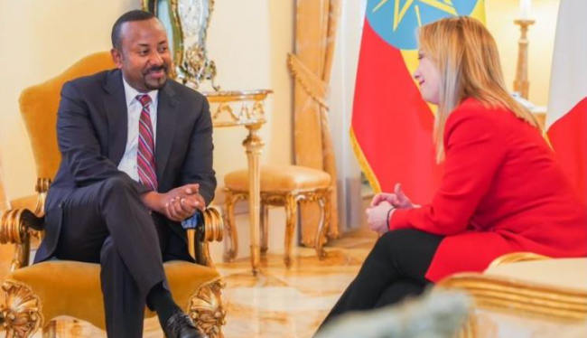 ቀዳመይቲ ሚኒስተር ኢጣልያ፣ ጆርጂያ መሎኒ፣ ኣብ ዝሓለፈ ሰሙን ናብ ኣዲስ ኣበባ ኣብ ዘካየደቶ ወግዓዊ ናይ ስራሕ ምብጻሕ ምስ ቀዳማይ ሚኒስተር ኢትዮጵያ፣ ኣብይ ኣሕመድን ፕረዚደንት ሶማል፣ ሓሰን ሸኽ ማሕሙድን ብምርኻብ ዘትያ።
