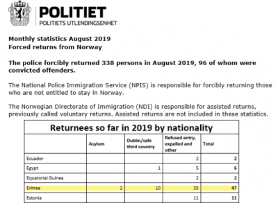 መንግስቲ ነርወይ፣ ኣብ ዓመት 2019፣ ናይ ዑቕባ ሕትኦም ዝነጸጎም፣ ኣቐዲሞም ኣብ ኢጣልያን ካልኦት ሃገራት ኤውሮጳ ናይ ኣጻብዕቲ ዓሸራ ዘለዎም ብመሰረት ስምምዕ ዳብሊንን ካልኦትን፣ 45 ናብ ዝተፈላለያ ሃገራት ኤውሮጳ ክመልስ እንከሎ፣ ክልተ ድማ ብወለንትኦም ናብ ኤርትራ ከምዝመለሶም ጸብጻብ ክፍሊ ኢምግሬሽን እታ ሃገር የመልክት።