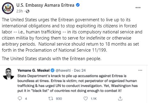 ኤምባሲ ኣመሪካ ኣብ ኣስመራ ኣብ ማሕበራዊ ገጻቱ ኣብ ዝዘርገሖ መልእኽቲ፣ መንግስቲ ኤርትራ ምስግጋር ደቂ-ሰብ ደው ከብል፣ ግዱድ ሃገራዊ ኣገልግሎት ከቋርጽን ብመልክዕ ምልሻ ህዝቢ ምዕጣቕ ደው ከብል ጸዊዑ።
