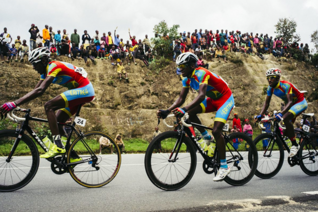 ኣብዚ ካብ ዮርክሻየር ዝተበገሰ ናይ ጽርግያ ሻምፕዮን ቅድድም ብሽኽለታ፣ ዋላ’ኳ ዝናብ ዝዓብለሎ ኩነታት ኣየር እንተነበረ፣ ባንዴራን ስእልታት ተቀዳደምቲን ዝሓዙ ኣማኢት ኤርትራውያን ንሃገራዊት ጋንትኦም ብድሙቕ ክድግፉ ተራእዮም።