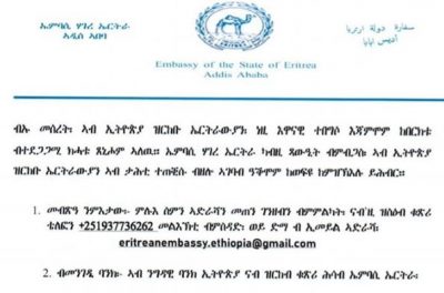 መራሕቲ ኤርትራን ኢትዮጵያን ድሕሪ ዝገበሩዎ ምስጢራዊ ዘተ፣ ኤርትራውያን ዝነበሩዎ መዓስከር ስደተኛታት ክዕጾ፣ በቲ ካልእ ወገን ከኣ፣ ኣብ ኢትዮጵያ ኤርትራዊ ስደተኛ የለን ዝብል ፖለቲካዊ ጎስጓስ ይካየድ ምስ ምህላዉ፣ ኣብታ ሃገር ዝርከቡ ኤርትራውያን ኣብ መዋጥር ኣትዮም ከምዘለዉ’ዩ ዝግለጽ።