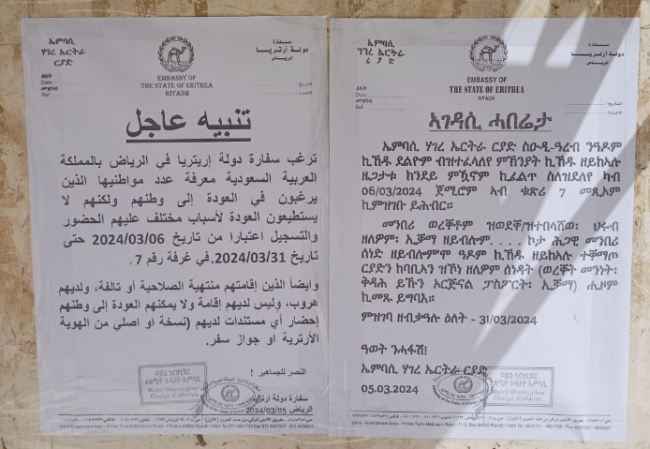 ኣብ ሪያድ ዝመንበሩ ኤምባሲ ኤርትራ ኣብ ስዑዲ ዓረብ፣ መንበሪ ፍቓድ ከሕድሱ ንዘይክእሉ ኤርትራውያን ናብ ዓዶም ንምምላስ ዳግማይ ጻውዒት ኣቕሪቡ።