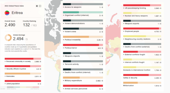 እቲ ትካል ኣብ ናይ 2022 ጸብጻቡ ኣብ ዘቐመጦ ዝርዝር፣ መጽናዕቲ ካብ ዘካየደለን 163 ሃገራት ዓለም፣ ብዘለዋ ሰላም ንኤርትራ ኣብ መበል 132’ዩ ኣቐሚጡዋ።