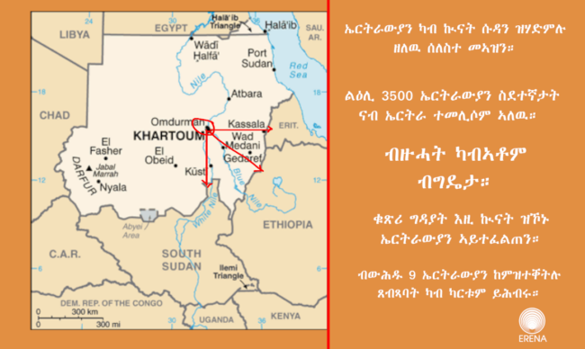 ኣብ ካርቱም ከባቢኣን ድሕሪ ዝተወልዐ ኵናት፣ ኣብታ ከተማ ዝነበሩ 10ታት ኣሽሓት ኤርትራውያን፣ ገሊኦም ናብ ደቡብ ሱዳን፣ ገሊኦም ናብ ኢትዮጵያ ገሊኦም ድማ ናብ ከባቢ ከሰላን ካልእ ከባቢታት ምብራቕ ሱዳንን ከምዝተበታተኑ ይፍለጥ።