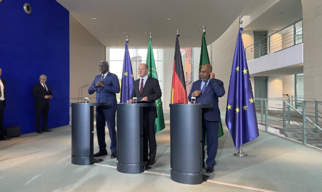 ጎኒ ጎኒ’ቲ ዋዕላ፣ ቻንስለር ጀርመን፣ ኦላፍ ሾልዝን ኣቦ መንበር ኮሚሽን ሕብረት ኣፍሪቃ፣ ሙሳ ፋኪን፣ ኣብ ዝተራኸብሉ ኣጋጣሚ ድማ’ዮም ኣብ ንምልዓት ኣፍሪቃ ዘተኮረ መደብ ኣብ ስምምዕ በጺሖም።
