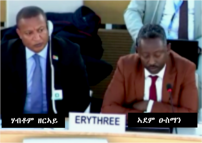 ፈጻሚ ጉዳያት ኤምባሲ ኤርትራ ኣብ ስዊዘርላንድን ወኪል ኤርትራ ኣብ ጄኔቫ – ሕቡራት ሃገራትን፣ ኣቶ ኣደም ዑስማን ንመንግስቲ ኤርትራ ራሕሪሑ።