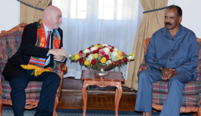 ስእሊ፣- ፕረዚደንት ፊፋ፣ ጂዮቫኒ ኢንቲፋኖ ኣብ ኤርትራ ኣብ ዝበጽሓሉ ኣብ 2019 ምስ ፕረዚደንት ኢሳይያስ ኣብ ዝተራኸበሉ እዋን- ካብ ኣርካይቭስ ኢንተርነት