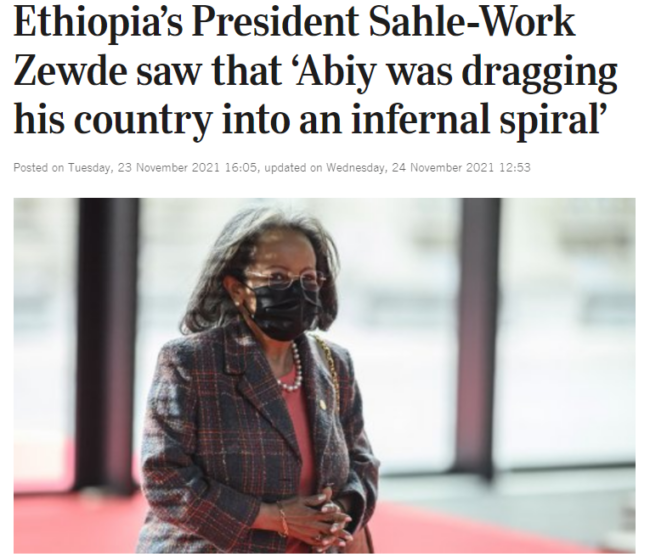 ፕረዚደንት ኢትዮጵያ ሳህለወርቅ ዘውዴ፣ ‘ቀዳማይ ኣብይ ኣሕመድ ነዛ ሃገር ናብ ኩሉ ዝልሕም ባርዕ ቀይሩዋ ኣሎ።’ ከምዝበለተ፣ ብቋንቋ ፈረንሳ ኣብ እትሕተም መጽሔት፣ ዠን ኣፍሪክ፣ ንዘቕረቦ ጸብጻብ ነጺጋቶ።