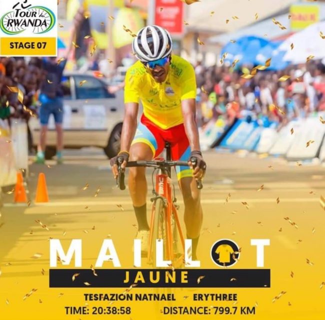 ብጫ ማልያ ለቢሱ ንኽብሩ ኣብ ምክልኻል ዝርከብ ኤርትራዊ ናትናኤል ተስፋጽዮን፣ ሎሚ ቀዳም ድሕሪ ቀትሪ ኣብ ዝተገብረ ናይ4.5 ኪሎ ሜትር ርሕቕት ዝነበሮ ናይ ክሮኖሜትር ውድድር፡ ብቀረባ ንዝወዳደሮ ዘሎ ርዋንዳዊ ሞይሰ ሙጊሻ 22 ካልኢታት ከሲብሉ።